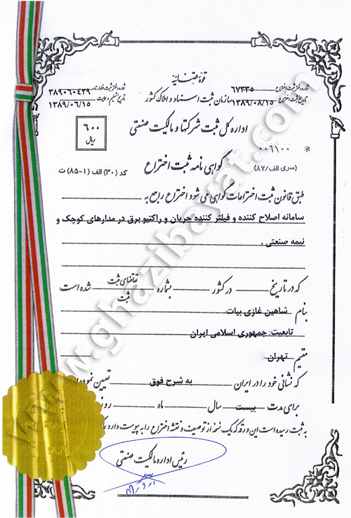 گواهینامه ثبت اختراع بهینه ساز مصرف برق