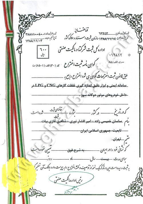 گواهینامه ثبت اختراع نشت یاب گاز خودرو